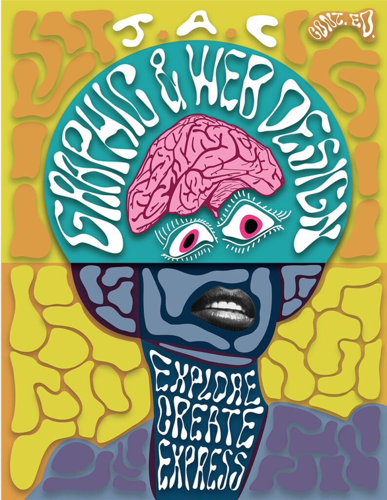 I made this illustration to represent the graphic and web design program at John Abbott College using Adobe Illustrator. My aim was to capture the creative energy of the program through vibrant colors, dynamic shapes, and playful elements. This piece is full of personality, showcasing both the endless possibilities in design and my enthusiasm for thinking outside the box!